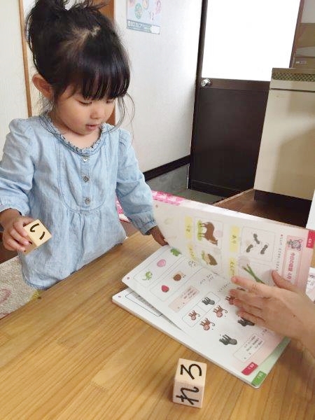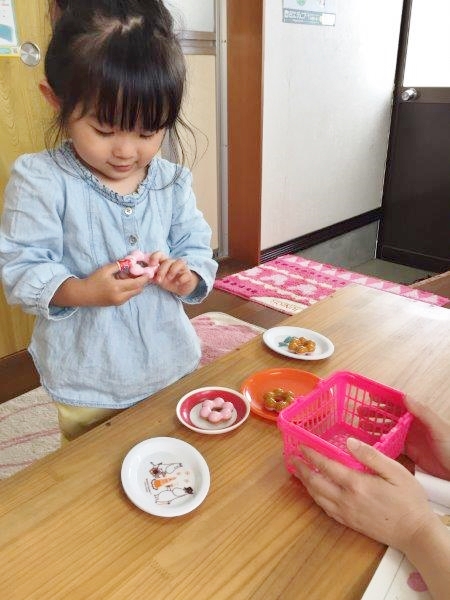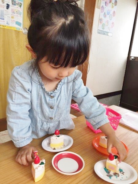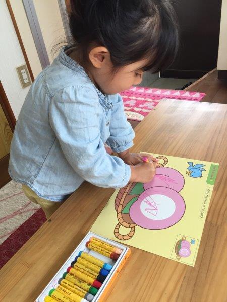 2歳児さんは、クレヨンをつかってワークをします。楽しみながら、筆圧が鍛えられています。