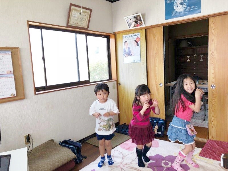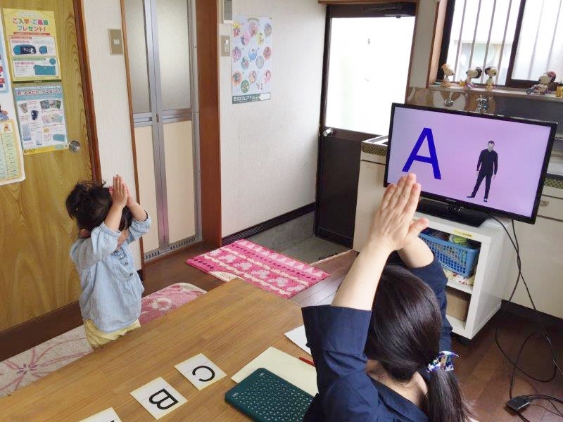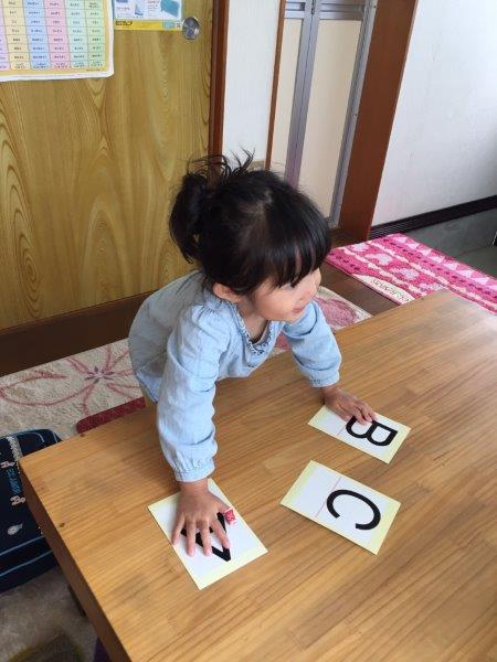 ABCソング、A,B,と指さしながら歌います。本当に、歌が大好きです!