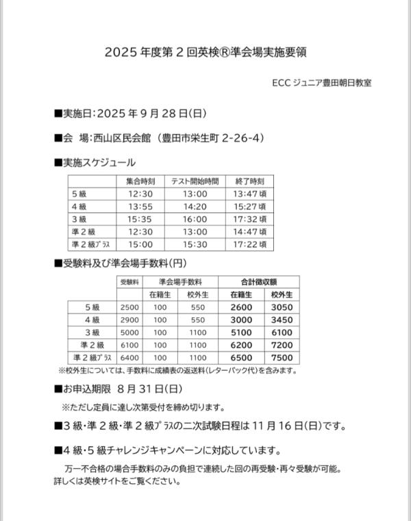 2025年度第2回英検® 準会場実施します