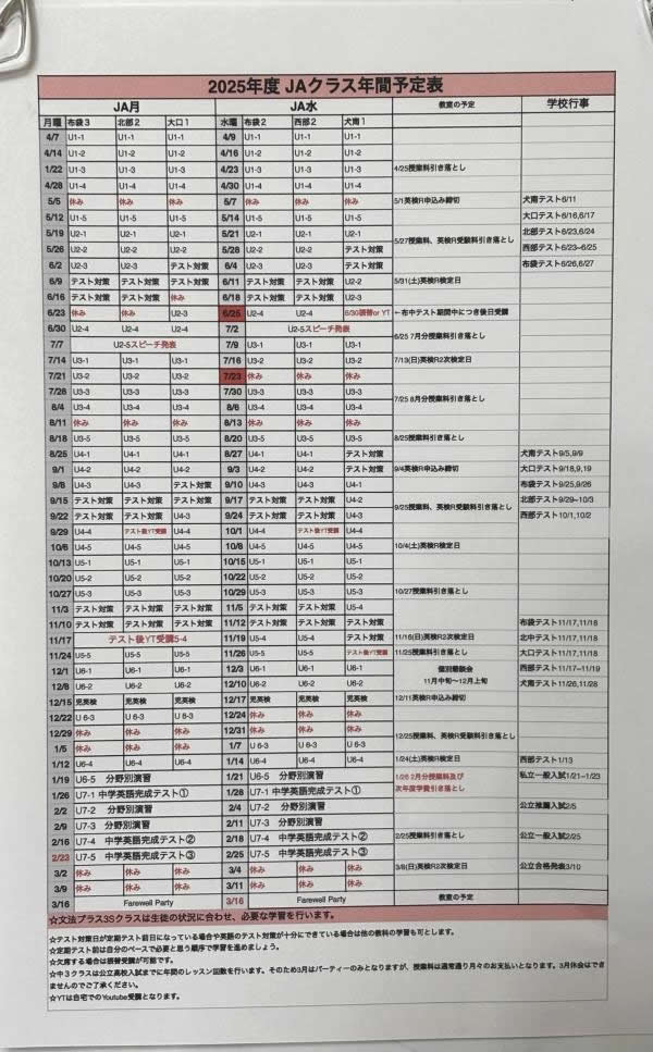 クラス編成は皆さんのご都合に合わせ、人数やメンバーのバランスを考えて行いました。基本的にはそれぞれにお知らせしたクラスにお越し下さい。ご都合が悪い場合には同レベル他クラスに振替出席して頂くか、レッスン録画をYouTubeでお送りします。単数クラス生はお休みされた場合はYouTubeでお送りします。欠席、振替の際はLINEでお早めにお知らせ下さい。