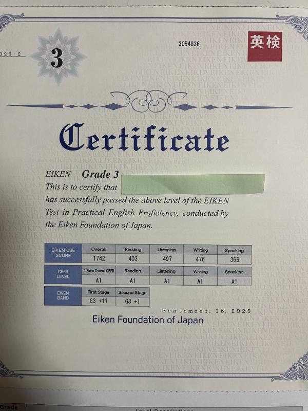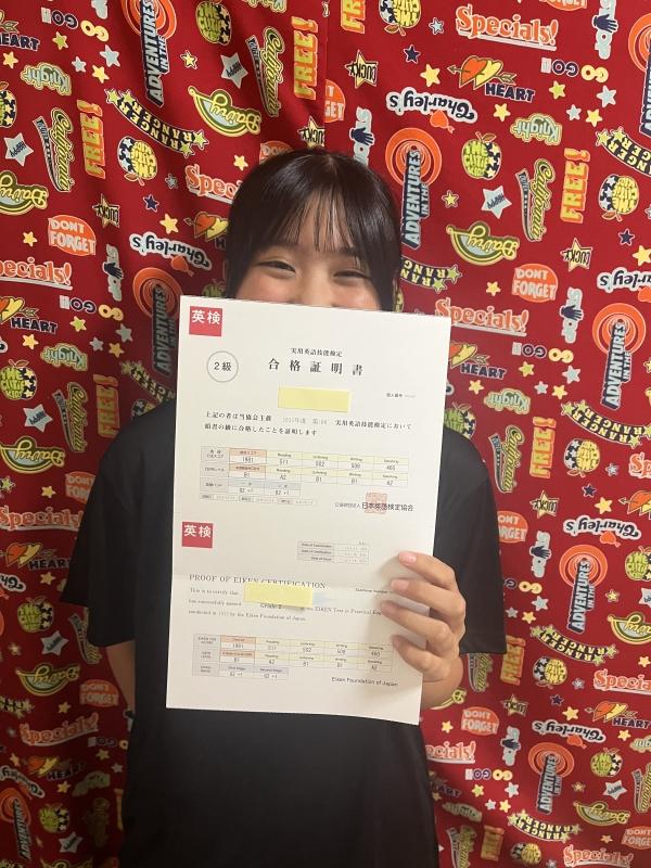 中学生の時から着実に英検®合格級を上げ続けて来ました。高校生になっても継続して英検®を受け続け、2年生で2級に合格しました!!