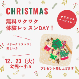 ★12月23日(火)に【クリスマスバージョン★無料ワクワク体験レッスンDAY!】を実施します。新年度の学年でお申し込みくださいね!