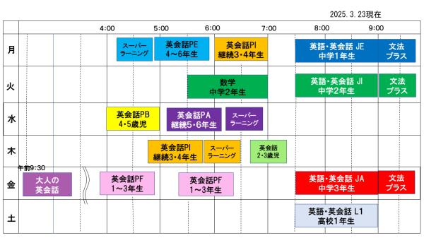 一週間のレッスンの時間です。予定が合わない場合などは、ご相談ください。