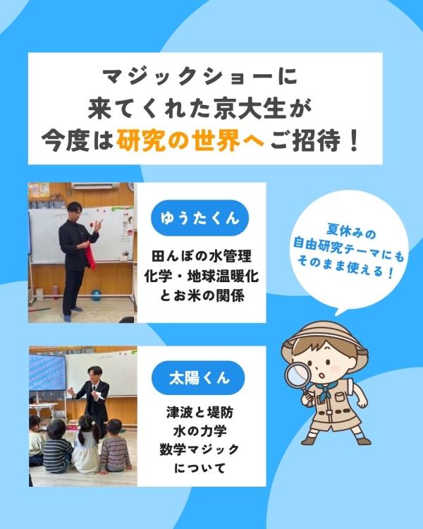 マジックショーで大人気だった 京大生のゆうたくんと太陽くん が、今度は 自由研究のサポーター としてやってきます!