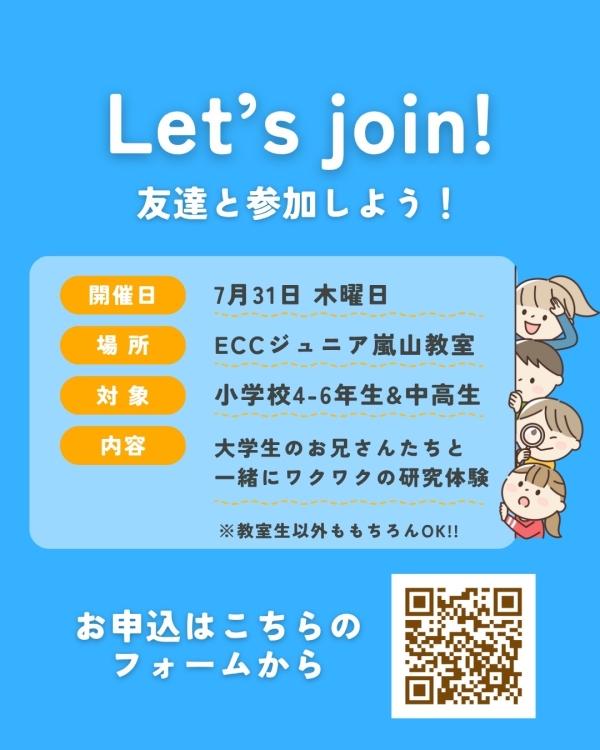 ぜひこの機会に、大学生のお兄さんたちと一緒に、ワクワクの研究体験をしてみませんか?