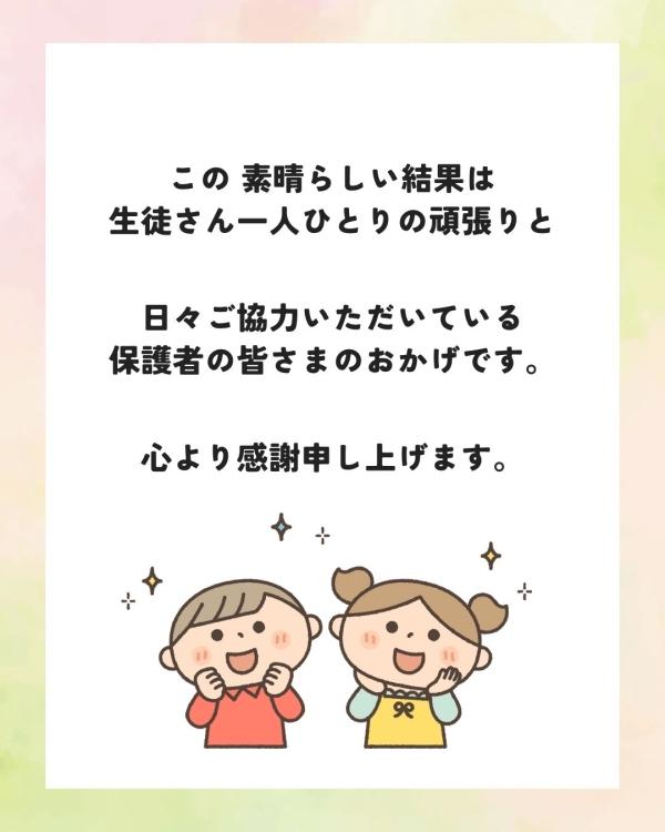 この素晴らしい結果は、生徒さん一人ひとりの頑張りと、日々ご協力いただいている保護者の皆さまのおかげです。心より感謝申し上げます。