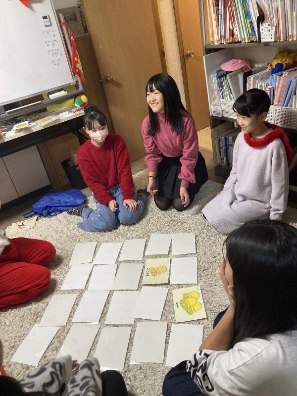 カードゲームでは、同じ絵柄のペアを見つける「神経衰弱」のクリスマス版をしました。今年はアレンジを加えて、単数形の絵柄と複数形の絵柄をペアとしました。生徒たちはカードをめくりながら、“This is a star.” “These are stars.”などというように文を作って言います。遊びながら単数形と複数形をバッチリ復習することができました!