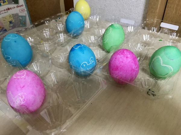 ゆで卵にシークレットクレヨンで絵を描き、色水につけると…絵が浮き上がってきます。