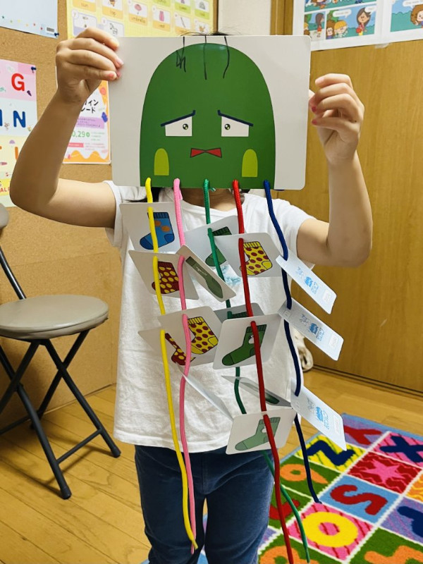 まずは1対1対応。色ひもを足に見立てて、一本に1枚ずつ靴下カードをつけていきます。カードの穴にひもを通す作業も指先を使って楽しんでいます。