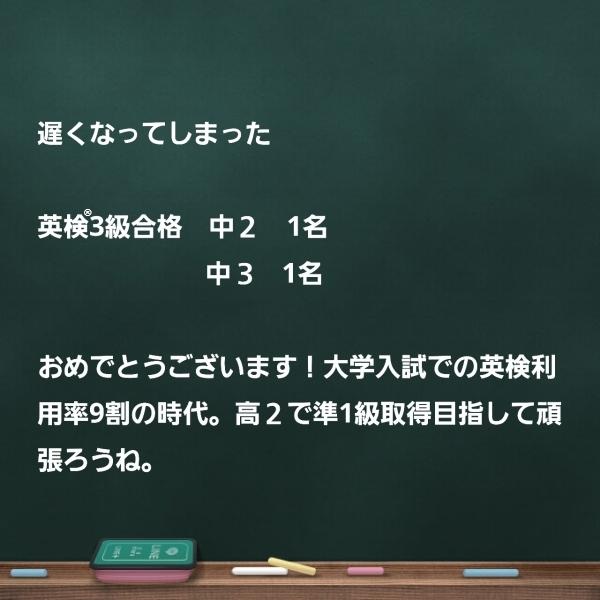 2025.5.12 英検®合格 2024年度英検® 4級小学4年生 1名合格 2024年度英検® 3級 中学生 2名合格 お問い合わせフォーム お名前 必須 漢字 フリガナ 電話番号 必須 ※半角数字・ハイフンなし ※携帯電話可。普段ご連絡のとりやすい電話番号をご記入ください。 メールアドレス 必須 ※半角英数字 ※ご自身のメール設定上、ご連絡のメールが受信できない場合がございます。数日経っても連絡がない場合は再度お問い合わせください。 ※Gmailをご利用の場合、受付完了のメールが迷惑メールフォルダへ送付される場合がございます。 受講者のお名前 上記と同じ 漢字 フリガナ 受講者の性別 男 女 受講者の生年月日 年を選択 2025年(令和07年) 2024年(令和06年) 2023年(令和05年) 2022年(令和04年) 2021年(令和03年) 2020年(令和02年) 2019年(平成31・令和元年) 2018年(平成30年) 2017年(平成29年) 2016年(平成28年) 2015年(平成27年) 2014年(平成26年) 2013年(平成25年) 2012年(平成24年) 2011年(平成23年) 2010年(平成22年) 2009年(平成21年) 2008年(平成20年) 2007年(平成19年) 2006年(平成18年) 2005年(平成17年) 2004年(平成16年) 2003年(平成15年) 2002年(平成14年) 2001年(平成13年) 2000年(平成12年) 1999年(平成11年) 1998年(平成10年) 1997年(平成09年) 1996年(平成08年) 1995年(平成07年) 1994年(平成06年) 1993年(平成05年) 1992年(平成04年) 1991年(平成03年) 1990年(平成02年) 1989年(平成元年) 1988年(昭和63年) 1987年(昭和62年) 1986年(昭和61年) 1985年(昭和60年) 1984年(昭和59年) 1983年(昭和58年) 1982年(昭和57年) 1981年(昭和56年) 1980年(昭和55年) 1979年(昭和54年) 1978年(昭和53年) 1977年(昭和52年) 1976年(昭和51年) 1975年(昭和50年) 1974年(昭和49年) 1973年(昭和48年) 1972年(昭和47年) 1971年(昭和46年) 1970年(昭和45年) 1969年(昭和44年) 1968年(昭和43年) 1967年(昭和42年) 1966年(昭和41年) 1965年(昭和40年) 1964年(昭和39年) 1963年(昭和38年) 1962年(昭和37年) 1961年(昭和36年) 1960年(昭和35年) 1959年(昭和34年) 1958年(昭和33年) 1957年(昭和32年) 1956年(昭和31年) 1955年(昭和30年) 1954年(昭和29年) 1953年(昭和28年) 1952年(昭和27年) 1951年(昭和26年) 1950年(昭和25年) 1949年(昭和24年) 1948年(昭和23年) 1947年(昭和22年) 1946年(昭和21年) 1945年(昭和20年) 1944年(昭和19年) 1943年(昭和18年) 1942年(昭和17年) 月を選択 1月 2月 3月 4月 5月 6月 7月 8月 9月 10月 11月 12月 日を選択 1日 2日 3日 4日 5日 6日 7日 8日 9日 10日 11日 12日 13日 14日 15日 16日 17日 18日 19日 20日 21日 22日 23日 24日 25日 26日 27日 28日 29日 30日 31日 受講者の年齢・学年 年齢・学年を選択 0~1歳児 2歳児 幼児・年少 幼児・年中 幼児・年長 小学1年生 小学2年生 小学3年生 小学4年生 小学5年生 小学6年生 中学1年生 中学2年生 中学3年生 高校生 短大生 大学生 専門学校生 社会人 主婦 その他 メッセージ 問い合わせをする