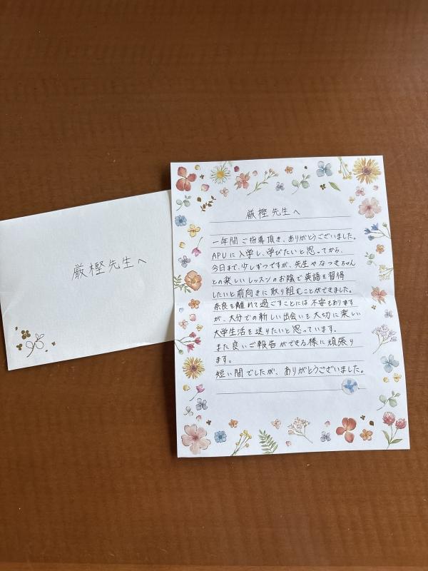 一年間ご指導頂き、ありがとうございました。APUに入学し、学びたいと思ってから今日まで少しずつですが、先生やクラスメートとの楽しいレッスンのお陰で英語を習得したいと前向きに取り組むことができました。奈良を離れて過ごすことには不安もありますが、大分での新しい出会いを大切に楽しい大学生活を送りたいと思っています。