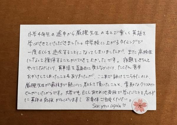 小学4年生の途中から厳樫先生のもとで楽しく英語を学ばせていただきました。中学校に上がるタイミングで一度ECCを退会することになってしまいましたが、また高校生になって復帰することができてよかったです。宿題をきちんとやってこなかったり、英単語を真面目に覚えなかったり、たくさん苦労をおかけしてしまったこともありましたが、ここまで続けてこられたのは厳樫先生に最後まで熱心に教えて頂いたことと、素敵なクラスメートがいたからです。大学でもECCあやめ池南教室で学んだことを忘れずに英語の勉強がんばります。お身体ご自愛ください。