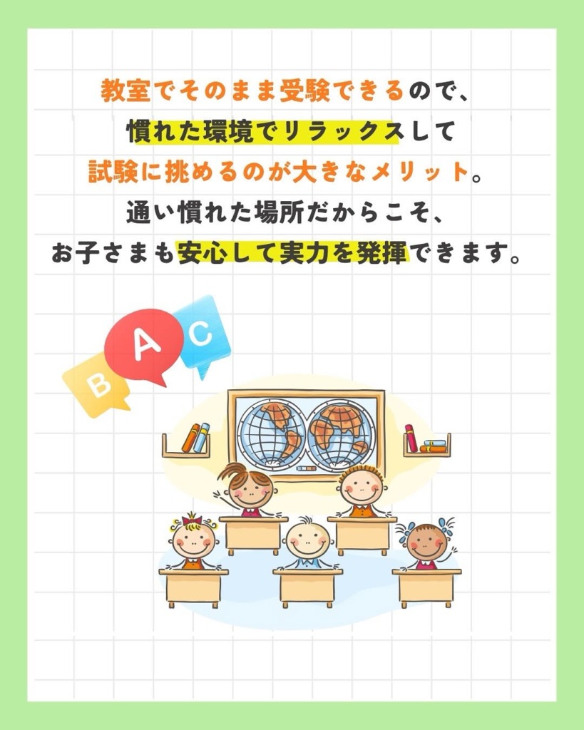 教室でそのまま受験できるので、慣れた環境でリラックスして試験に挑めるのが大きなメリット。通い慣れた場所だからこそ、お子さまも安心して実力を発揮できます。
