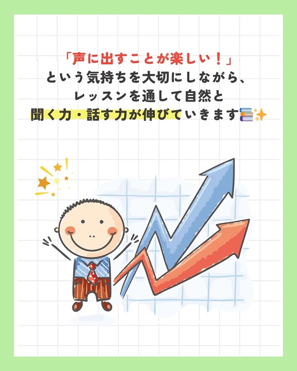「声に出すことが楽しい!」という気持ちを大切にしながら、レッスンを通して自然と聞く力・話す力が伸びていきます♪