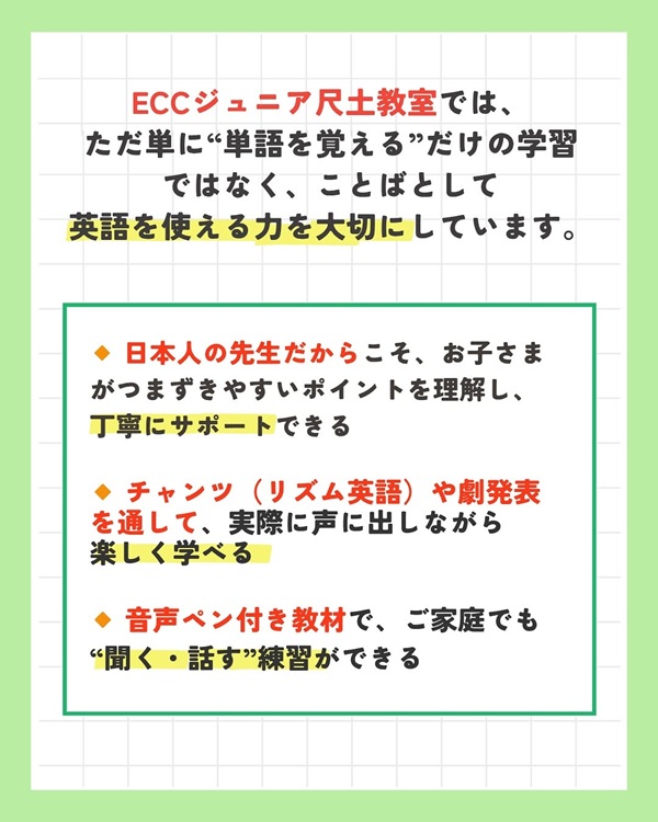 ECCジュニア尺土教室では、ただ単に“単語を覚える”だけの学習ではなく、ことばとして英語を使える力を大切にしています。
