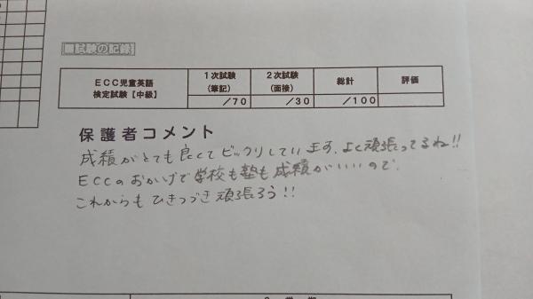 成績がとても良くてビックリしています。よく頑張ってるね!ECCジュニアのおかげで学校も塾も成績がいいので、これからもひきつづき頑張ろう!