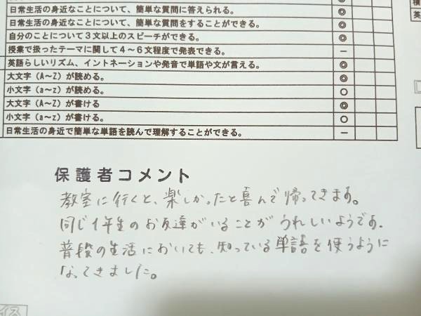 同じ一年生のお友達がいることがうれしいようです。普段の生活においても、知っている単語を使うようになってきました。