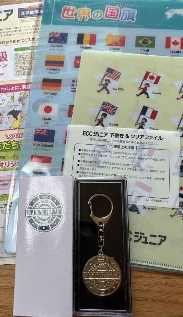 今年の参加賞は世界国旗の下敷き&クリアファイル。メダルは筆記試験とインタビューテスト両方とも満点の生徒さんに贈られます。今年は1名の方が授与されました。