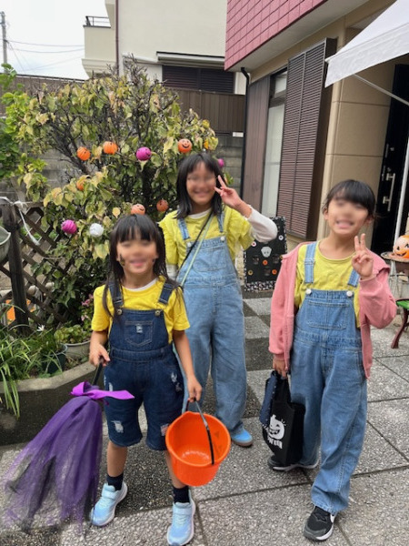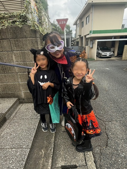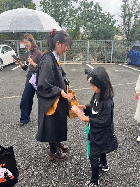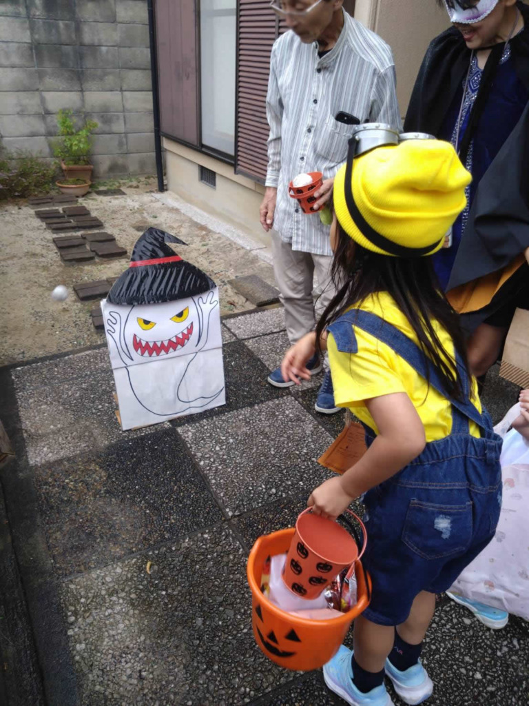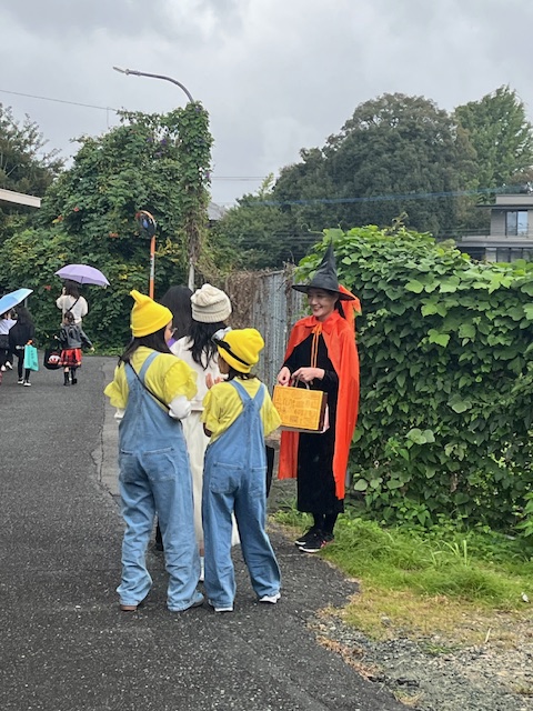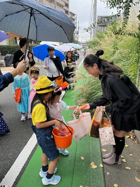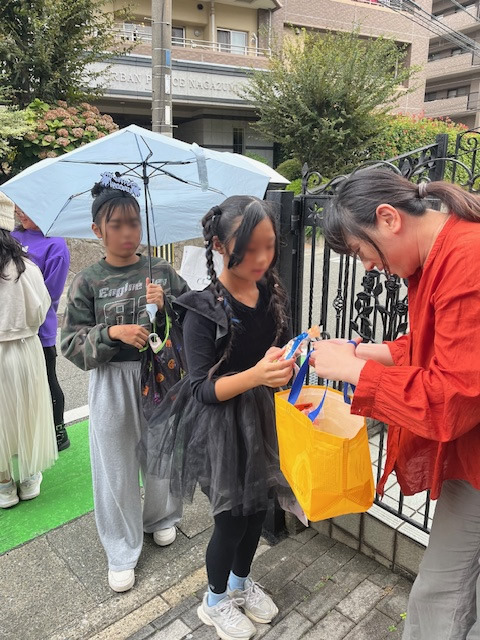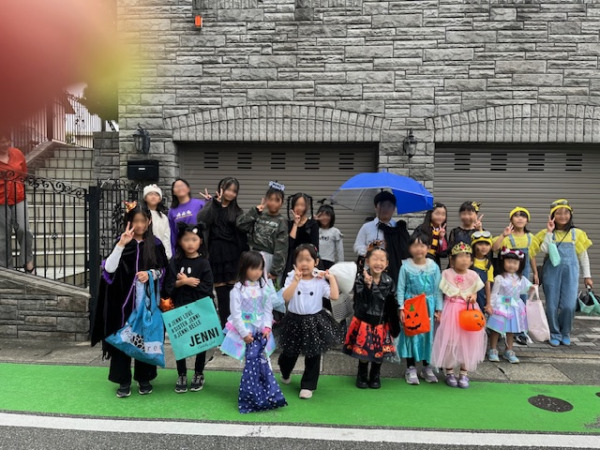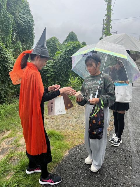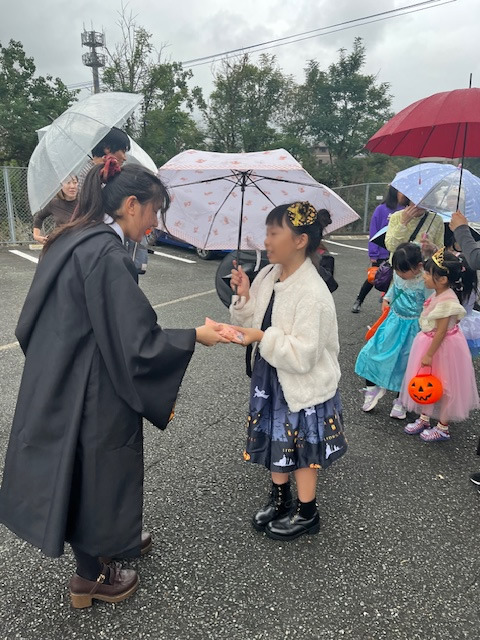 ハロウィンウォークの後には教室の駐車場でゲームもしました。残念だったのはお天気で、朝晴れていたのですが14時くらいからポツポツきてなんとかウォークする時までは小雨で回れたのでが、ゲームの途中から雨がひどくなり、それでもメインのゲームだけやって2時間くらいの予定が1時間ぐらいで短縮して終わりました。それでもみんな楽しんでくれたみたいで、終わったその日に保護者からお礼とお菓子をたくさんもらって喜んでいた、ゲームもとても楽しかったと言うコメントが次々と来てとてもうれしかったです。生徒達が、大きくなった時、英語教室でのハロウィンウォークが楽しかったと思い出すことができるようにまた来年も頑張りたいと思います。