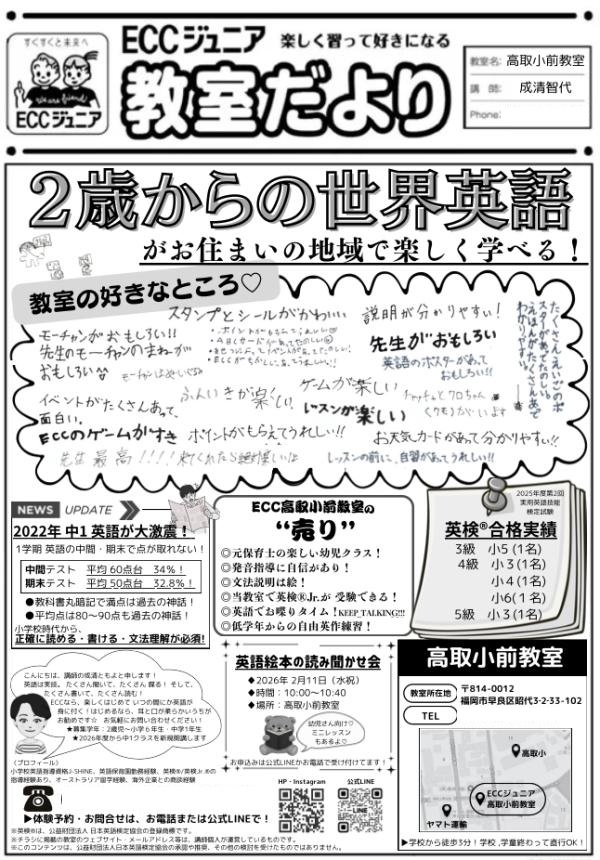 ECCジュニア高取小前教室では、2026年度の新規生徒を募集中です!