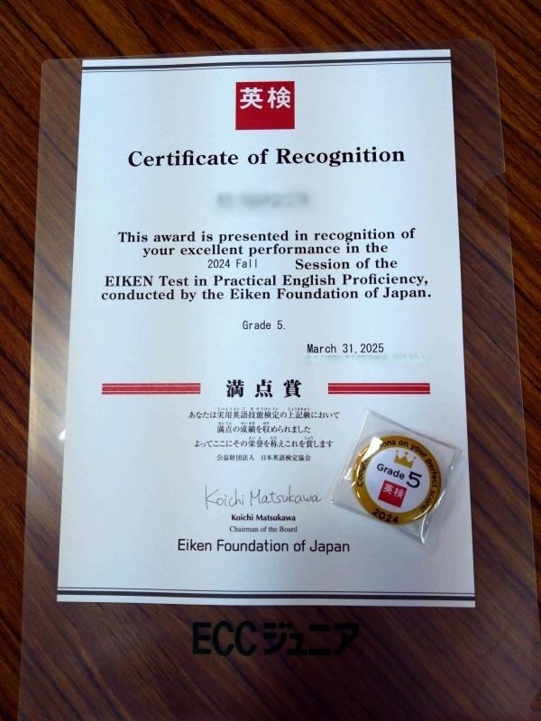 昨年度初めて英検®にチャレンジしたKクン。5級、見事パーフェクト合格を果たしました!後日、その栄誉を称える「満点賞」と記念バッヂが英検®協会より贈られました!