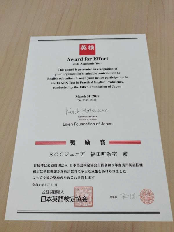 そして今回、福田町教室は日本英語検定協会から奨励賞を頂きました☆