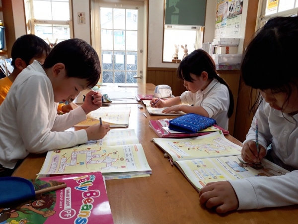 2年生 今年度 最後のレッスン。ワークブックを熱心にする子どもたち。