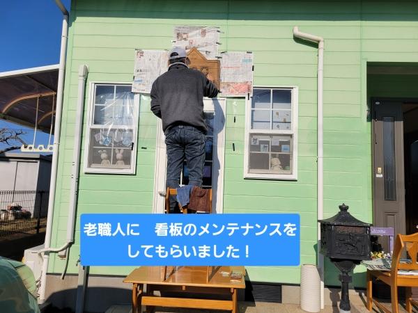 2000年に新築した際に友人に作ってもらった看板のメンテナンスを夫に頼みました。友人が書き、大工さんであるお父さんが彫ってくれた愛情こもった大切な看板なんです。