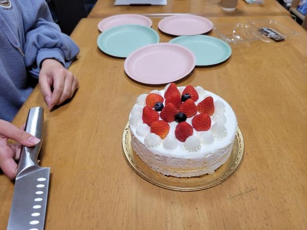 あーだこーだ言いながら作るのは楽しいです。 ケーキも用意しました。 勉強のときは長いけど パーティーだと短いね、だって。