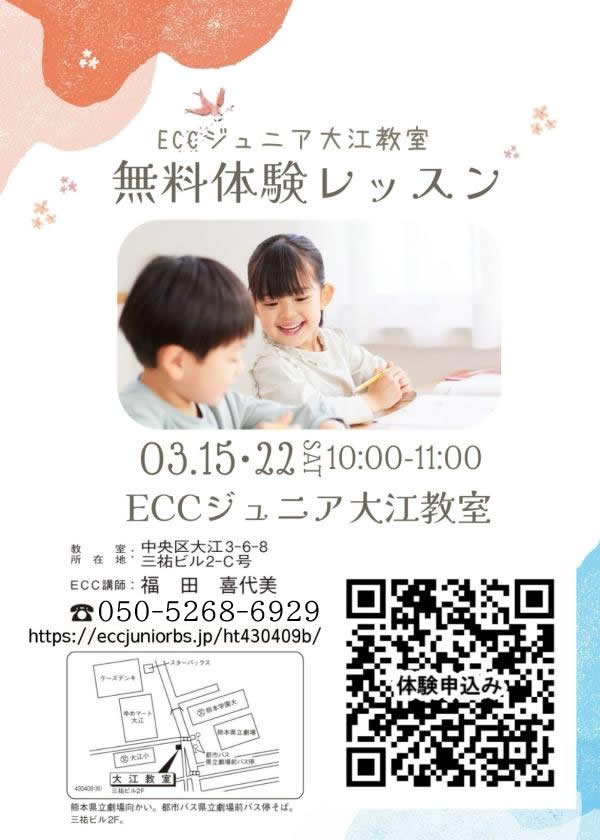 ECCCジュニア大江教室は大江小学校から徒歩1分です。学校帰りに教室に来るお子さんも多いです。熊本市中央区大江、新大江、帯山、新屋敷、水前寺にお住まいのお子様が通っています。校区は、大江校区、託麻原校区、白川校区、帯山校区、帯山西校区、砂取校区、出水校区などのお子さんが通っています。近くには敬愛幼稚園、大江子ども園、ひまわり保育園などがあります。