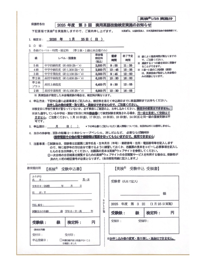 2025年度第3回の実用英語技能検定の受験者を受付いたします。