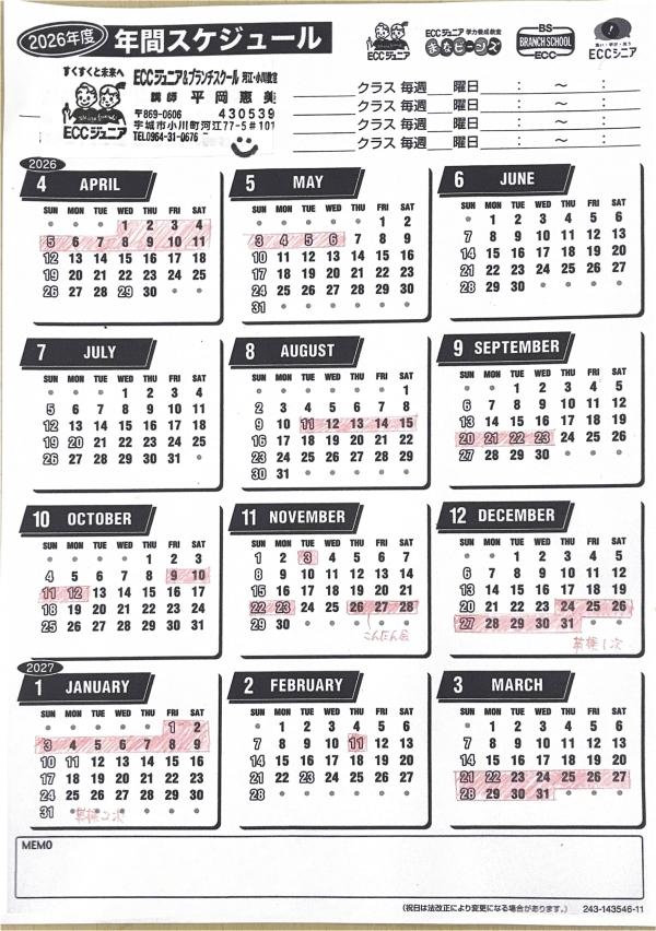 2026年度のスケジュールです。