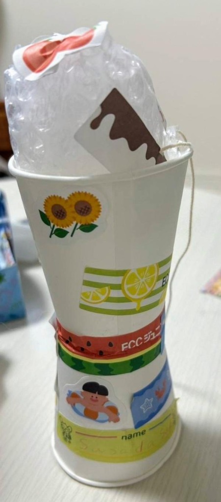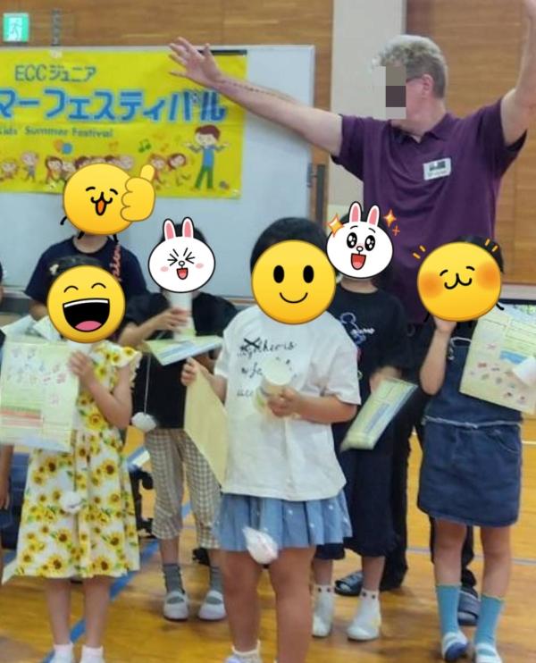 先日のサマー・キッズ・フェスティバルの写真です^^欠席などがありましたが、うちの生徒さんが固まって写っていたので、ここだけ切り取りました^^今年はクラフトで、「けん玉」をネイティヴ講師と作りました。英語で「けん玉」はなんと言うでしょうか?