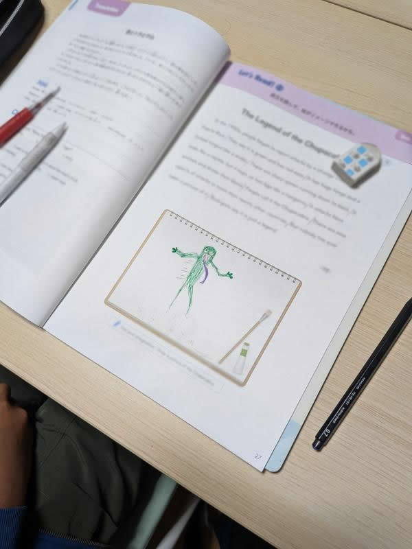今日の授業では、パッセイジを読み練習した後、絵を描くというものです。同じ文を読んでいるのに、同じ絵にならないのが面白いですね!みんな想像力を働かせ、楽しん描いていました