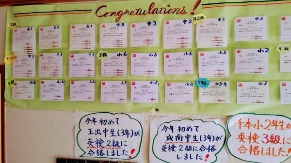 教室に掲示している英検®合格証のコピーです。全部は貼りきれませんが、年々増えていくのを楽しみにしています!
