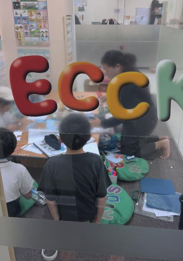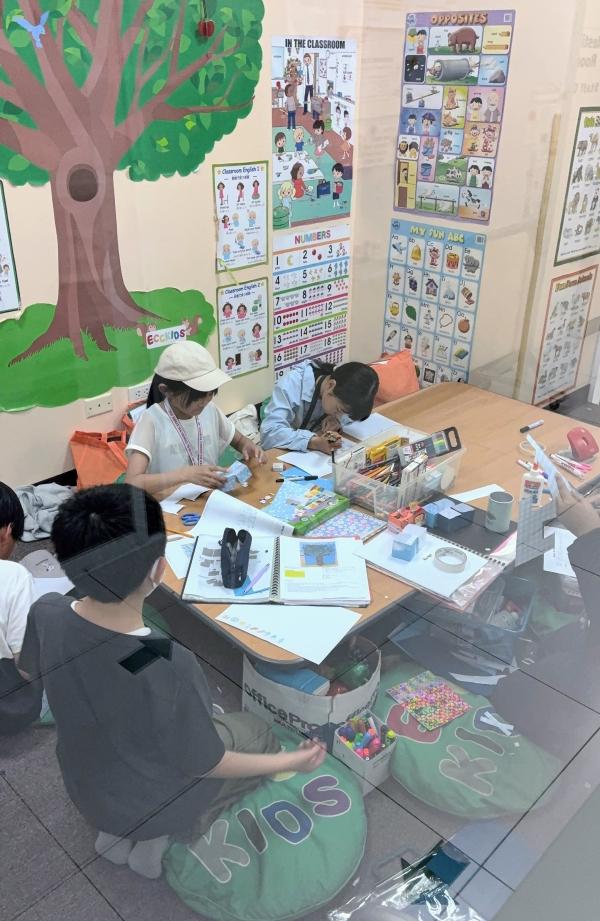 ガラス越しに撮った、小学生グループレッスンの様子。クラフトをしています。