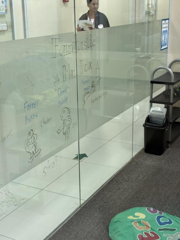 キッズルームのガラスはマーカーで字が書けるようになっていて、子ども達はお絵描きも楽しんでいます。