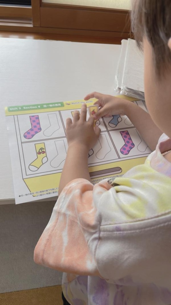 年少クラスは知育遊び「同一物の発見」を行いました。たくさんの似たような物の中から同じ物を見つけます。細部までしっかりと見て、観察力•注意力を養うことがねらいです。