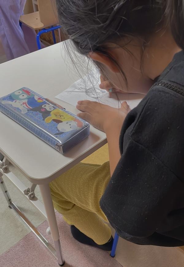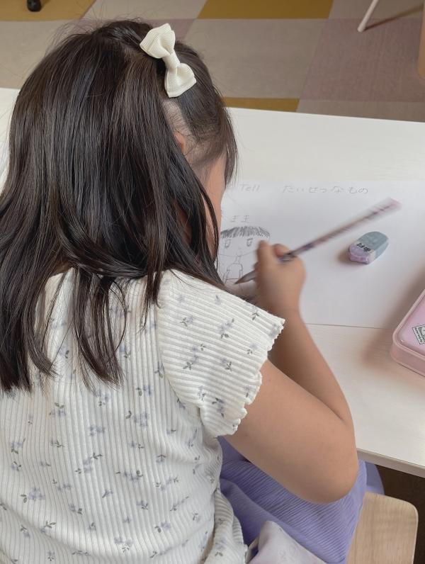 絵本を読んだ後は、みなさんにも「大切なもの」をテーマに絵を描いてもらいました。「恐竜」「家族」「ゲーム」「絵の具セット」など、それぞれの宝物を描いていました。