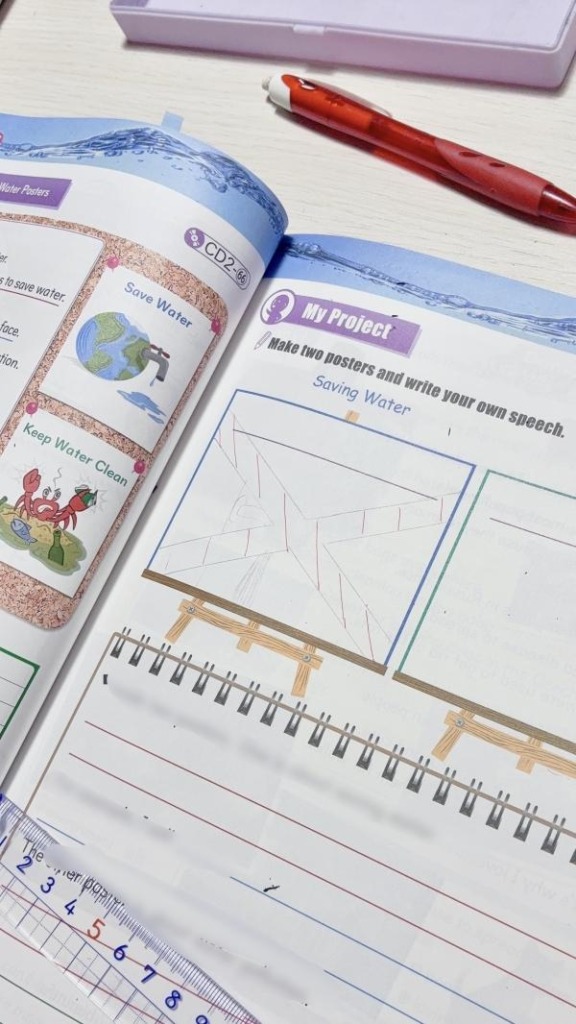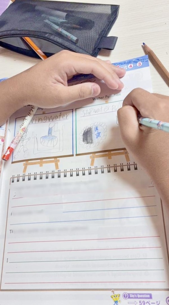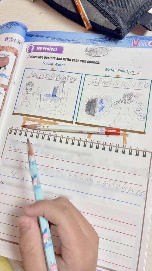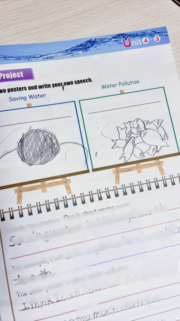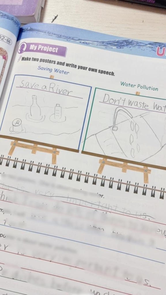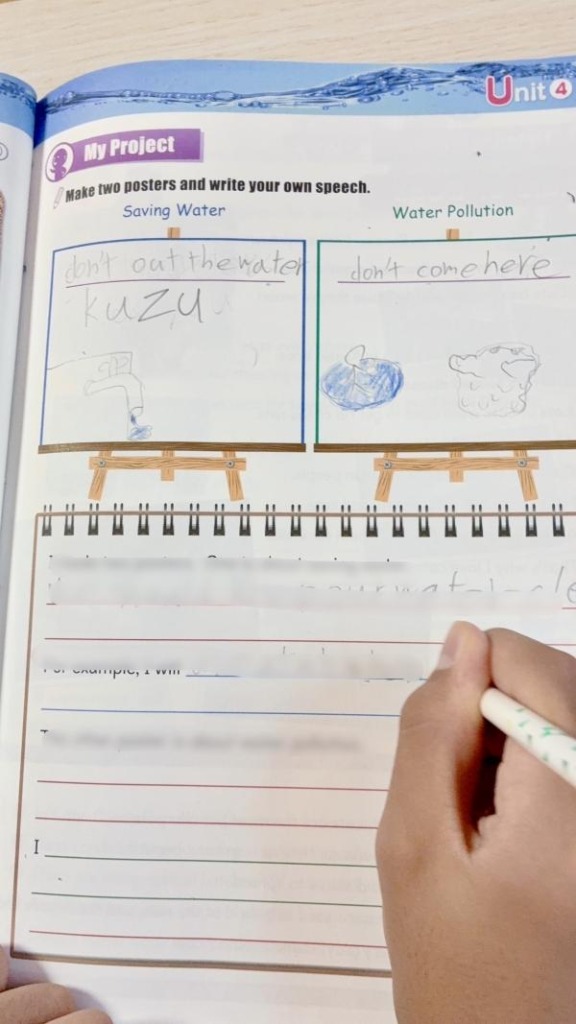 高学年クラスでは 「Water pollution」「Saving Water」 をテーマにポスターづくりに取り組みました。