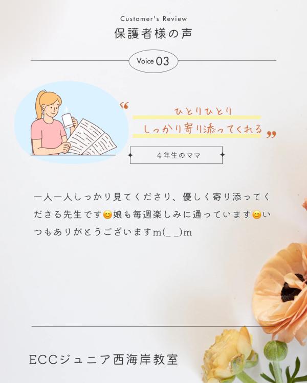 現在中学生ですが、教室に行くのをとても楽しみにしてます。先生も優しく楽しくレッスンしてくれます。最近では家で映画を見る時も英語を聞きながら字幕で見ています。